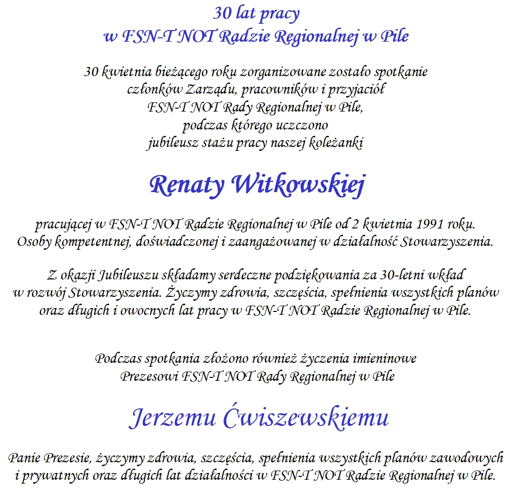 Zarząd Rady Regionalnej FSN-T NOT RR w Pile